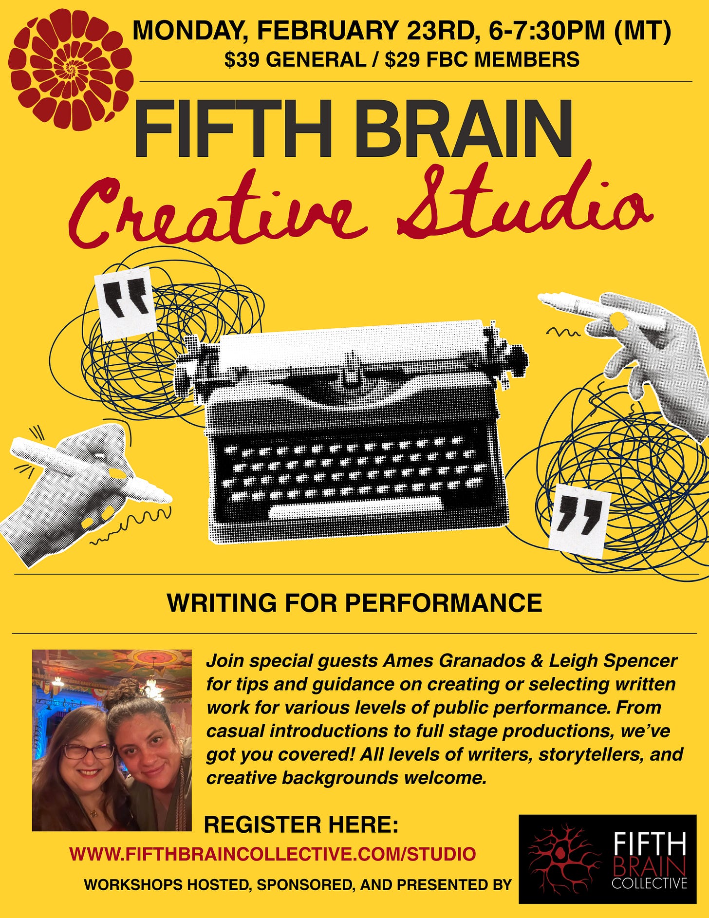 Fifth Brain Collective (FBC) is thrilled to launch a new program - Fifth Brain Creative Studio, which will feature special guest speakers presenting workshops across a wide range of writing genres and topics. The first workshop in this series, Writing for Performance, will be co-hosted by ames granados and Leigh Spencer. Read on to learn more about your hosts and the journey they can’t wait to share with you.